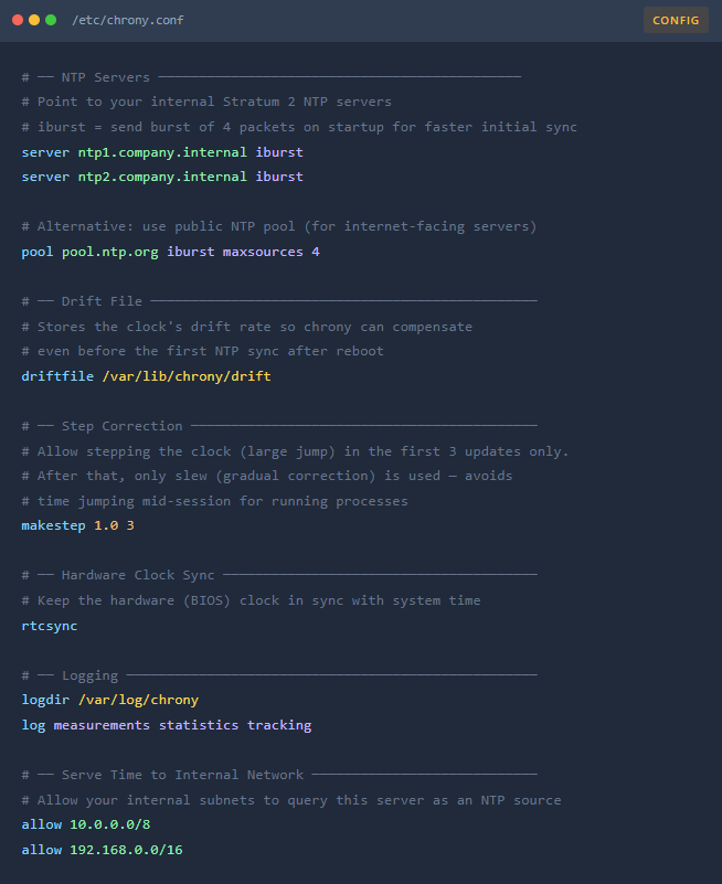 All Chrony configuration lives in one file: /etc/chrony.conf. Below is a typical enterprise configuration with every line explained.