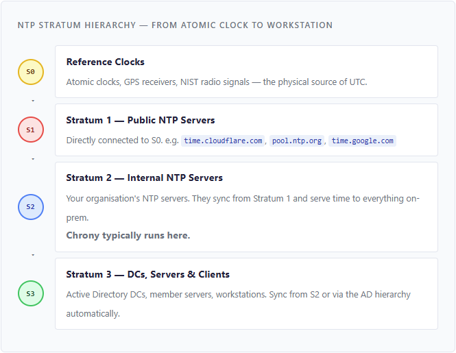 NTP is organized in a layered hierarchy called strata. Each stratum represents how many “hops” away a device is from a physical reference clock. The lower the stratum number, the more accurate — and authoritative — the time source.